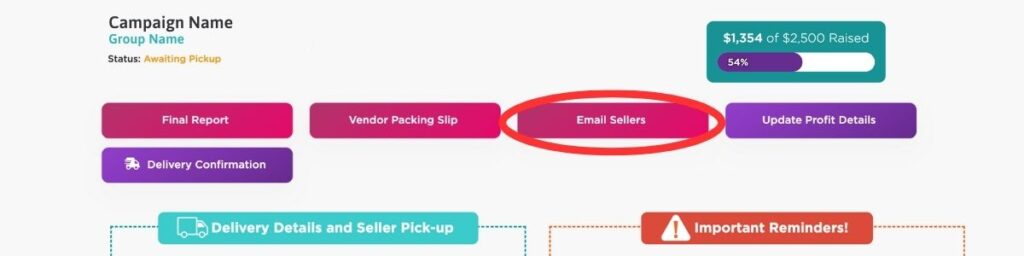 Want to email your sellers ahead of time to remind them of your delivery or request their help as volunteers? Click the “Email Sellers” button inside your Dashboard.