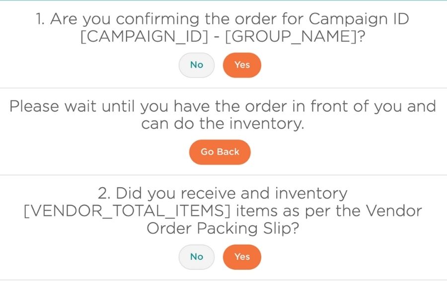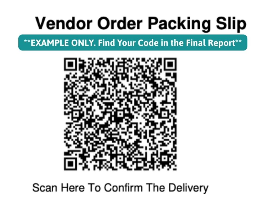 Before the driver leaves, scan the QR code at the top of Packing Slip B for EACH VENDOR that delivers to you to confirm the order.Ā