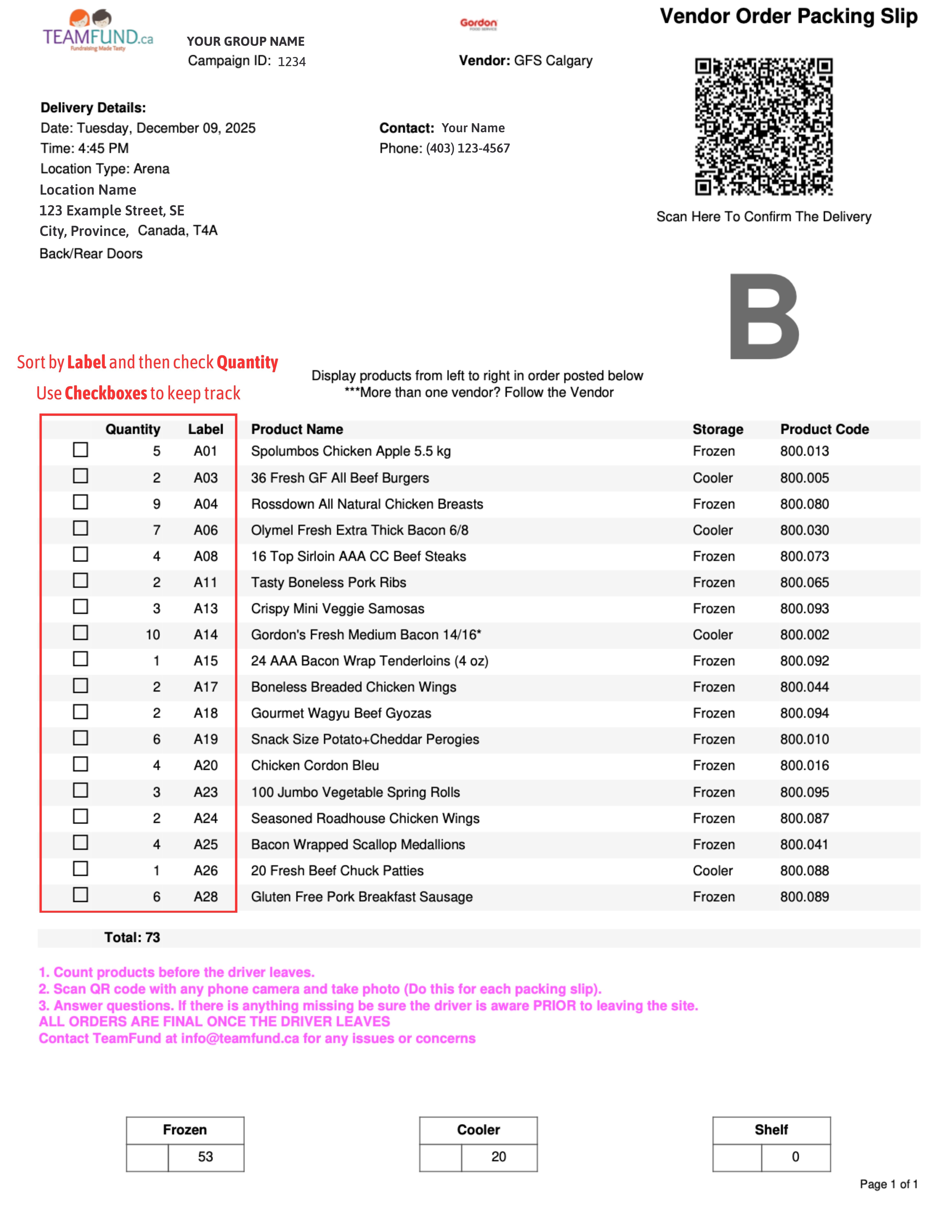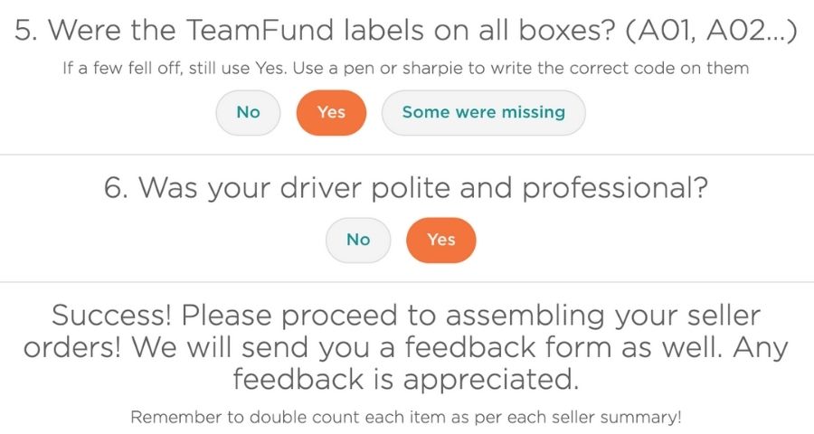 āš ļø All orders are considered final once the driver leaves. Count your inventory before they leave!!If something is missing, select “No” in your QR code questionnaire (see next step),notify the driver, and inform TeamFundĀ or we cannot replace it.