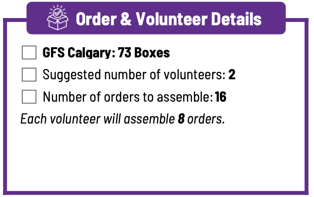 6. Repeat until all orders are assembled, and have two volunteers check each order to ensure it is accurate.