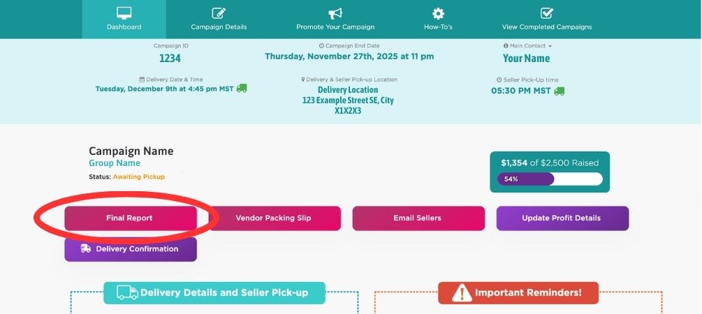 • We will send you an email the day after your campaign closes with your Final Report → searchĀ Organizer ReportĀ in your inbox