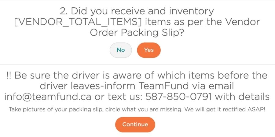 āš ļø All orders are considered final once the driver leaves. Count your inventory (see next step) before they leave!!If something is missing, select “No” in your QR code questionnaire, notify the driver, and inform TeamFund or we cannot replace it.