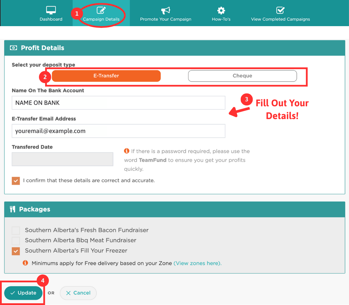 • Inform TeamFund via email (info@teamfund.ca) or send us a text at 587-850-0791
