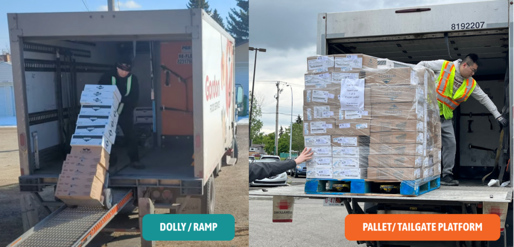 Depending on the size of your order and the type of truck, they may bring orders down a ramp with a dolly or on a pallet with a mechanical tailgate that lowers: